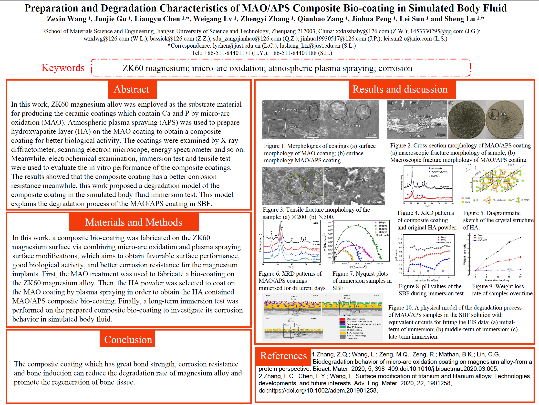 本次大会共设6场大会报告会、101场专题报告会、11个大会论坛以及海报交流等内容。公司教师和研究生聆听了郑玉峰、杨柯、张兰、朱波、任玲等知名教授的大会专题报告及大会论坛报告,做了“Growth mechanism of ceramic coating on ZK60 magnesium alloy using two stepscurrent-decreasing mode of micro-arc oxidation”“Preparation and Degradation Characteristics of MAO/APS Composite Bio-coating in Simulated Body Fluid”两个专题的会议交流,并就目前课题组已有成果和存在的问题向专家和同行进行讨论交流。